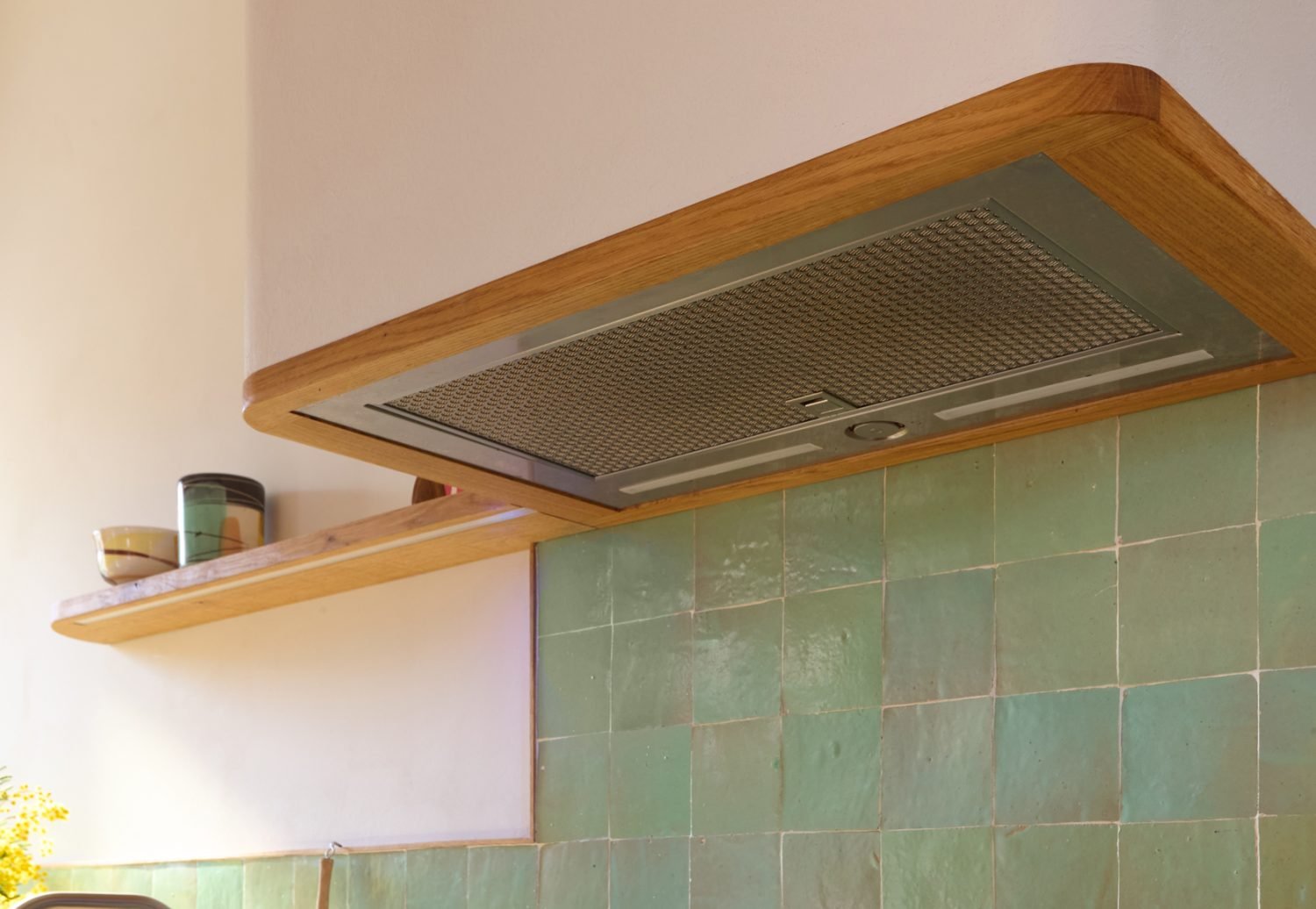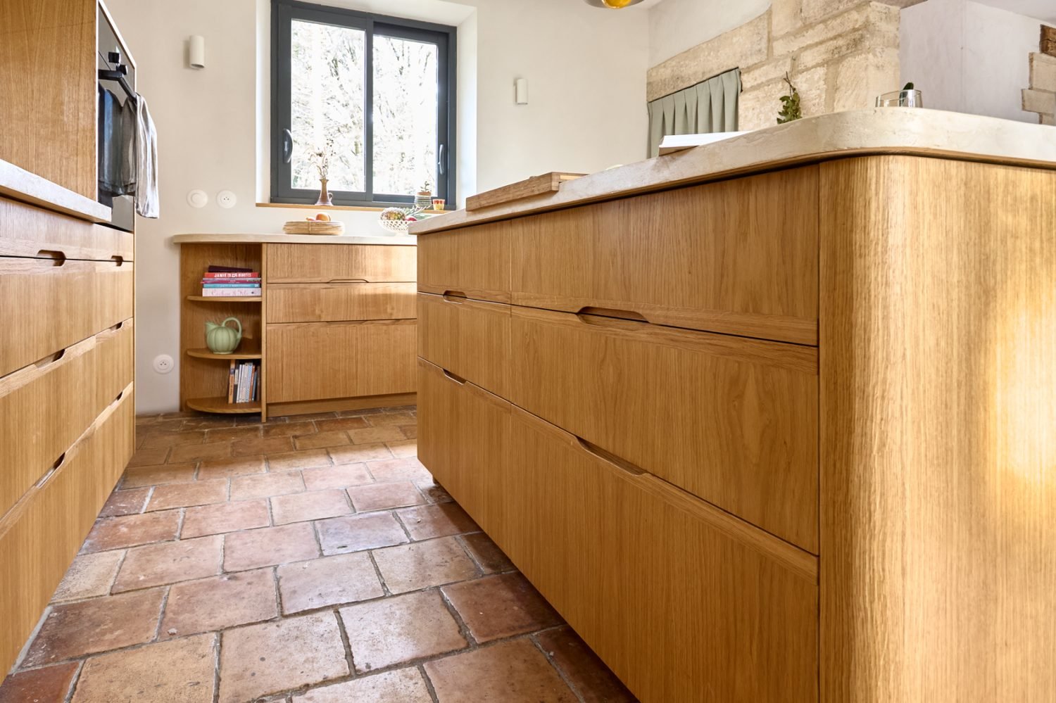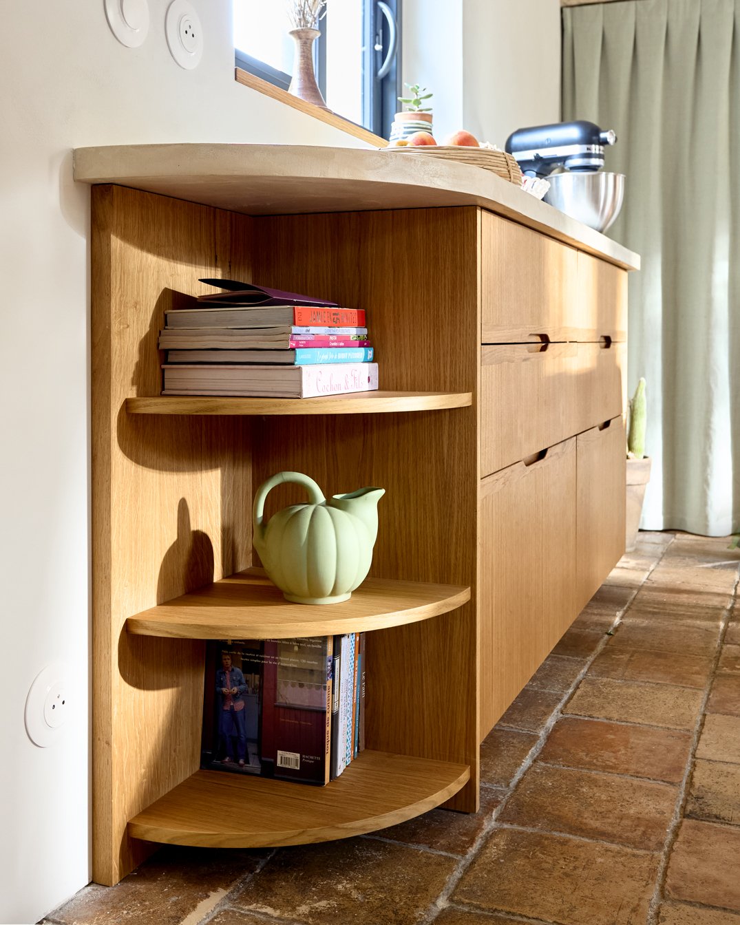 • Une étagère d’angle sur mesure, avec une structure en bois aux courbes douces, entièrement plaquée de chêne pour assurer une continuité élégante avec le reste de la cuisine.