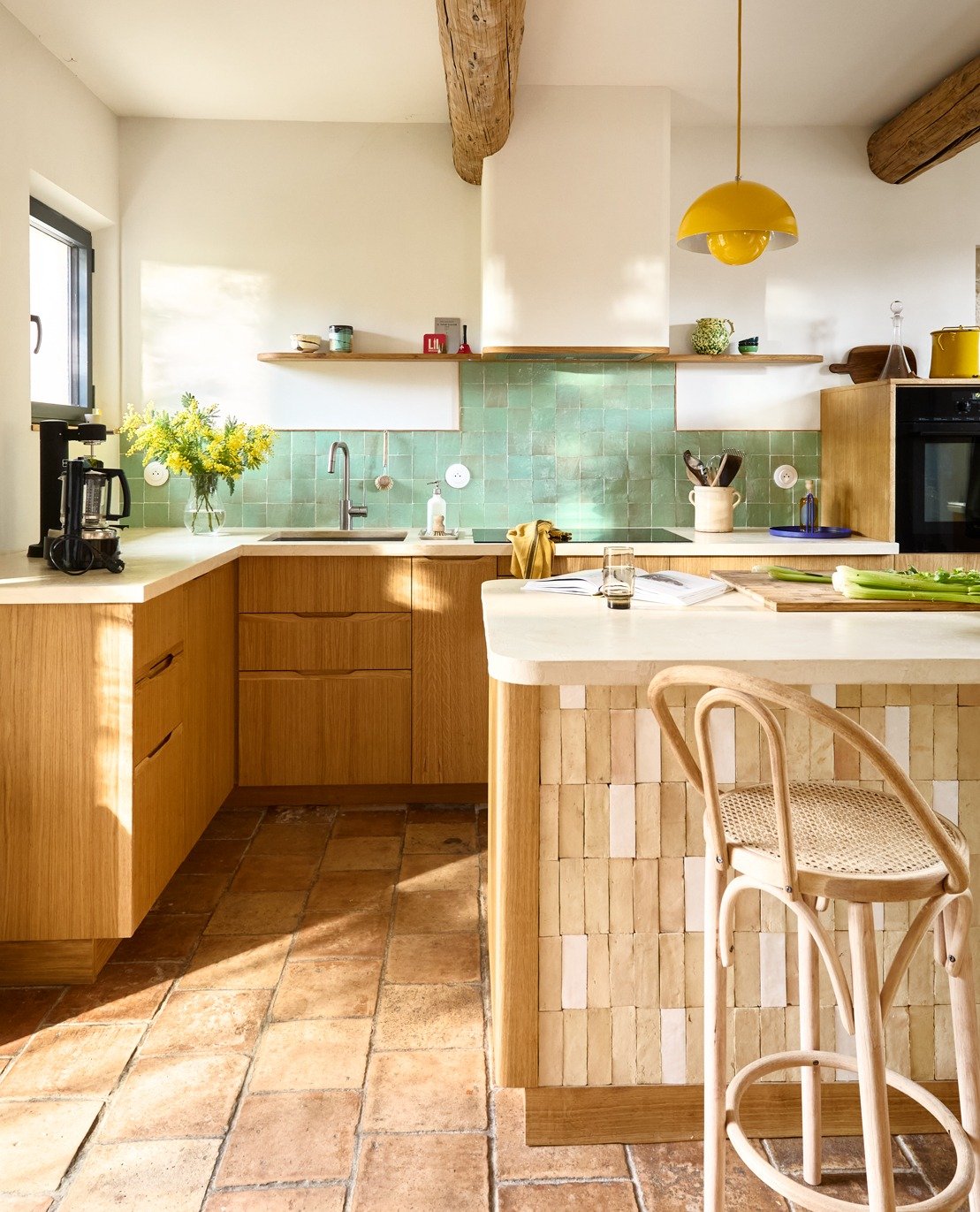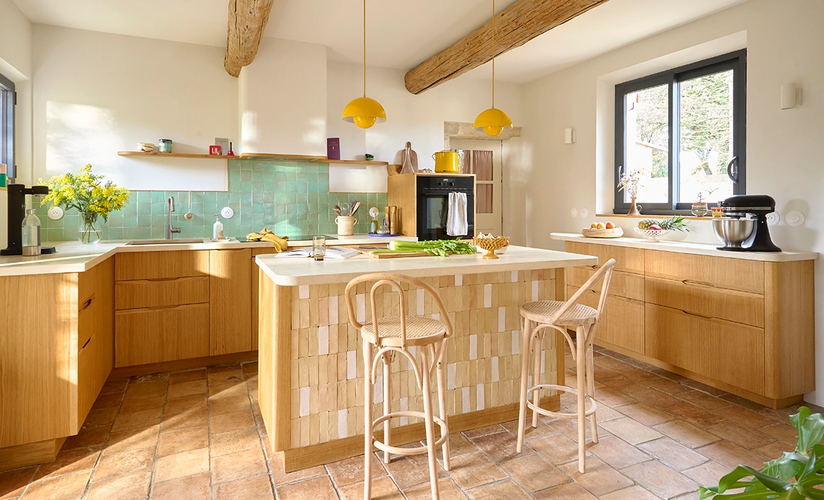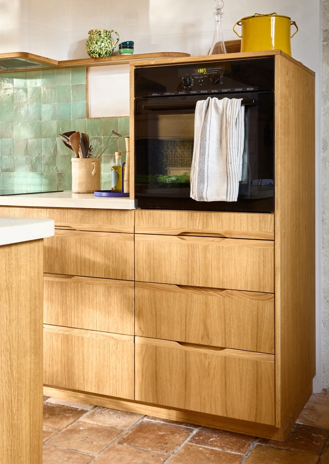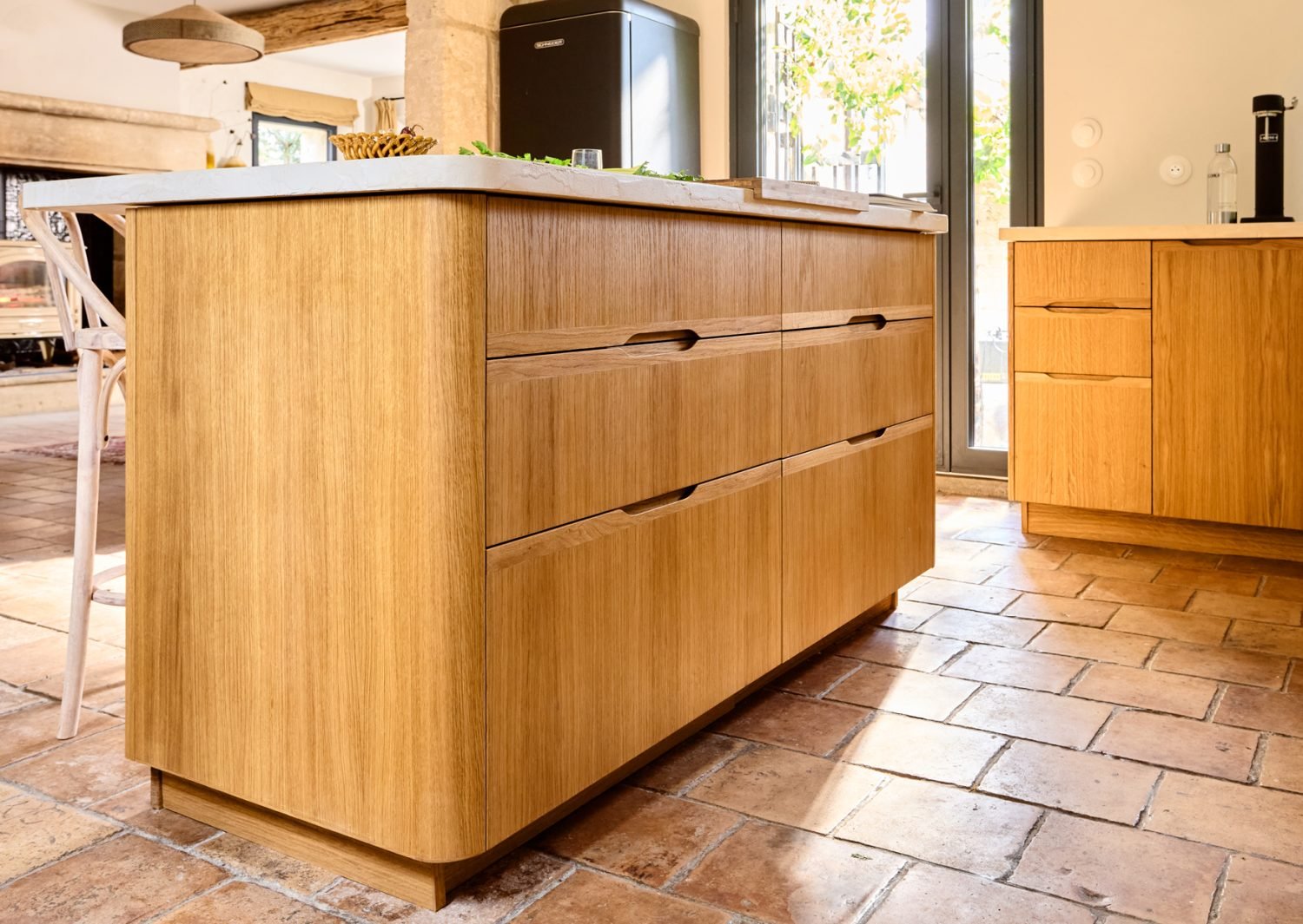 • Une étagère d’angle sur mesure, avec une structure en bois aux courbes douces, entièrement plaquée de chêne pour assurer une continuité élégante avec le reste de la cuisine.