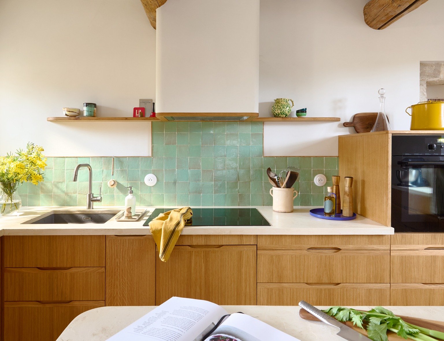 • Enfin, un habillage sur mesure pour la hotte a été conçu et installé. Sa partie inférieure est soulignée par une finition en chêne, prolongée de chaque côté par des étagères en chêne, qui apportent à l’ensemble cohérence, chaleur et légèreté visuelle.