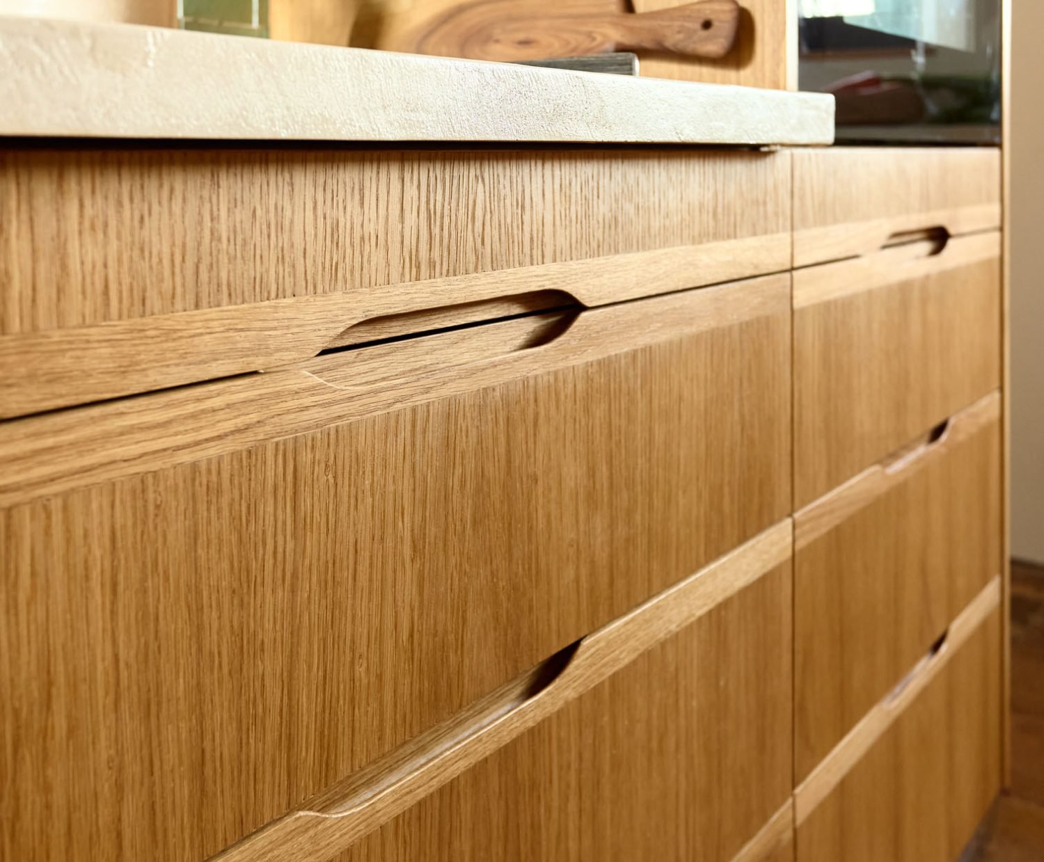 • Les poignées intégrées, elles aussi en chêne massif, ont été façonnées directement dans le bois pour s’intégrer naturellement au design et apporter une prise confortable.