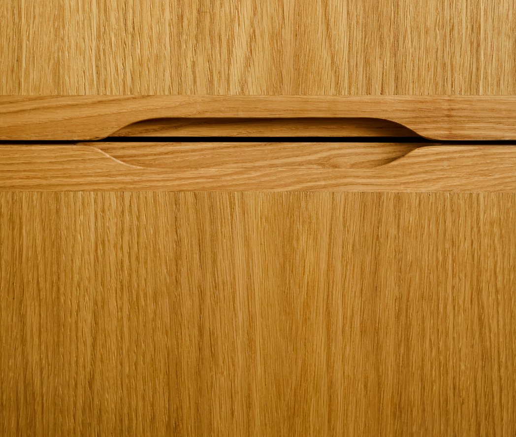 • Chaque façade est réalisée en panneau d’aggloméré plaqué chêne, avec des chants en chêne massif soigneusement ajustés à la main.